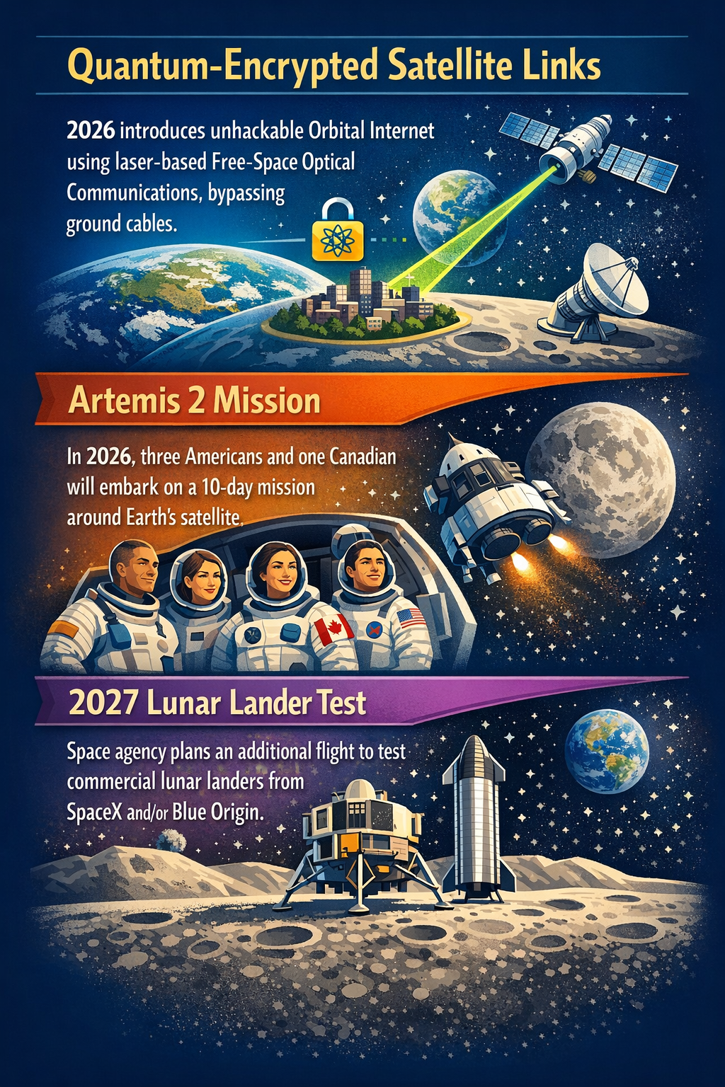 - Best-Case Scenario: Quantum-encrypted orbital internet is successfully deployed alongside thriving commercial lunar missions and AI-powered space infrastructure with strong international cooperation and minimal geopolitical friction.