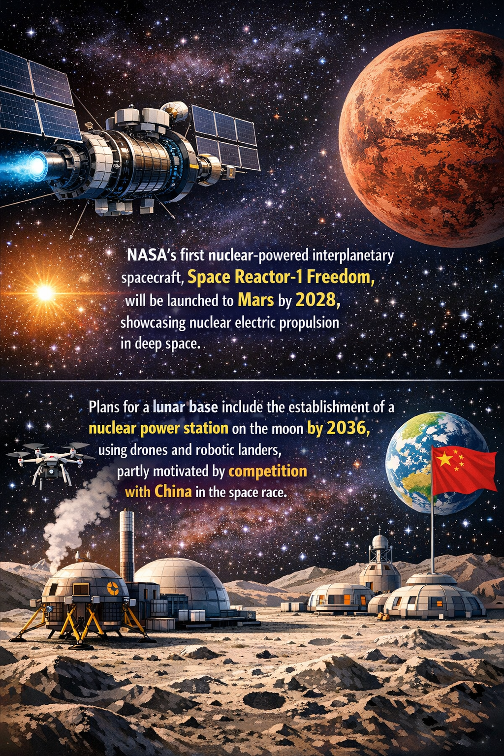 - Challenges: Managing orbital debris and congestion to prevent catastrophic collisions; ensuring technological reliability of emerging nuclear propulsion systems; mitigating geopolitical tensions arising from lunar base competition.