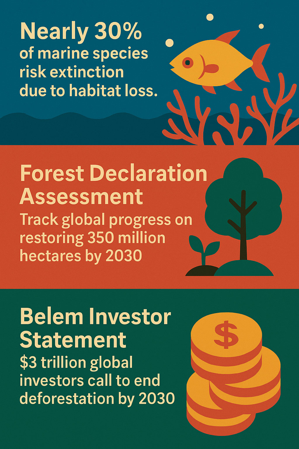 The Forest Declaration Assessment coalition tracks global pledge progress on eliminating deforestation and restoring degraded lands. It aims to mobilize restoration efforts on 350 million hectares by 2030 (Forest Declaration, 2025). However, current evidence shows deforestation and fires threaten forest carbon sinks, as seen in the Amazon’s potential shift to a net carbon source driven by drought and heat extremes (Mail & Guardian, 2025). These ecological tipping points could cause abrupt changes in carbon markets, investment portfolios, and regulatory frameworks.