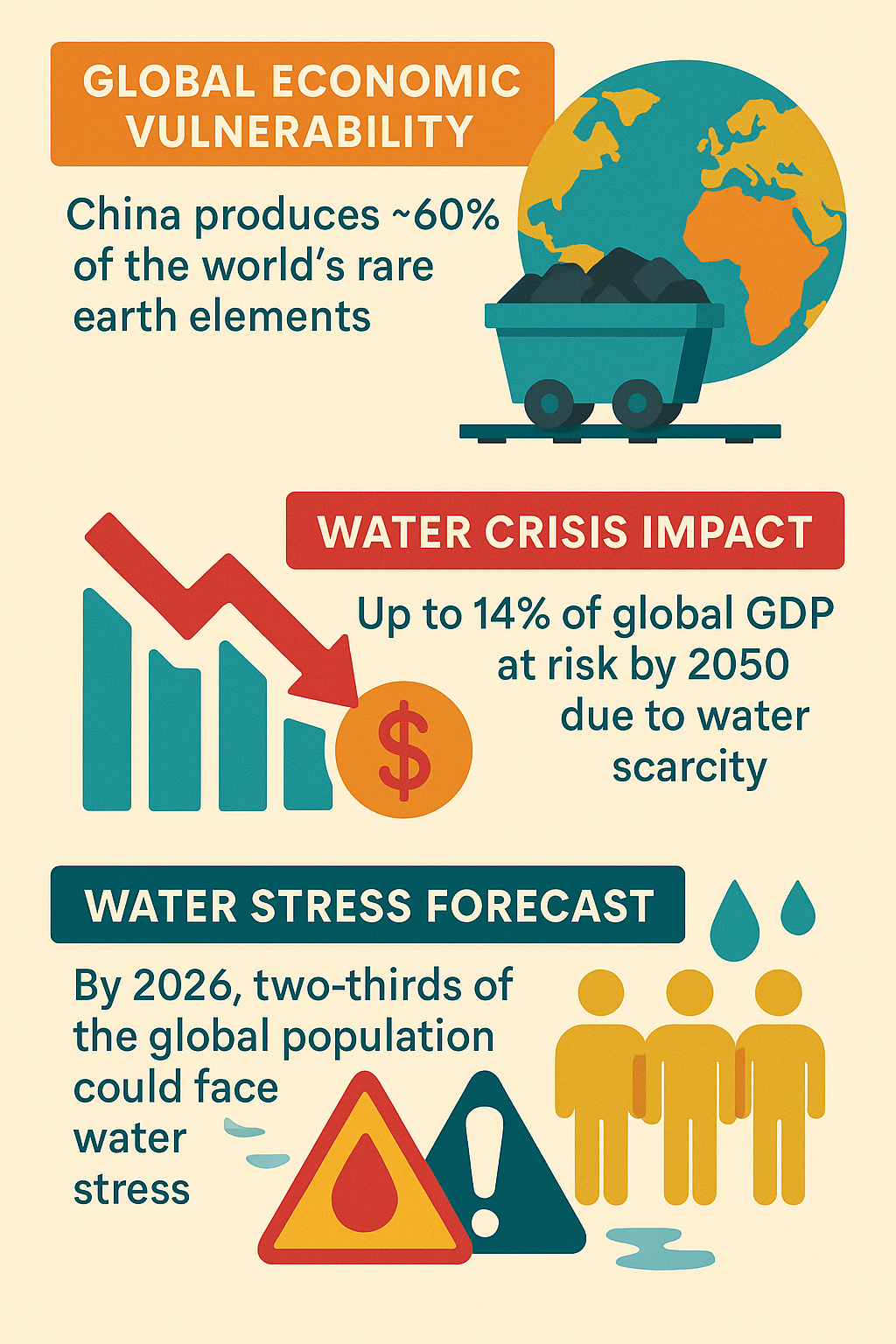 These parallel developments—critical mineral supply concentration and worsening water scarcity—are not often analyzed together but represent a novel convergence that could heighten disruptions. Mining and refining are water-intensive activities vulnerable to climate-driven shortages. Thus, water stress may become a non-traditional choke point for supply chains already strained by geopolitical and economic factors.
