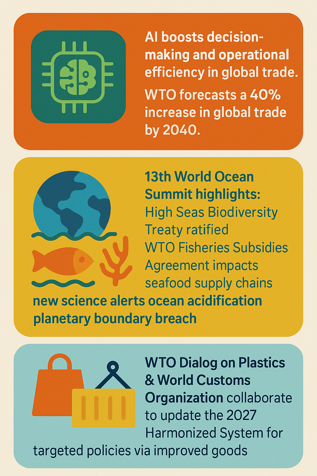 In the environmental and resource sectors, new multilateral agreements such as the High Seas Biodiversity Treaty and WTO Fisheries Subsidies Agreement are reshaping supply chains by enforcing sustainability, further complicating global trade dynamics (The Economist Events).
